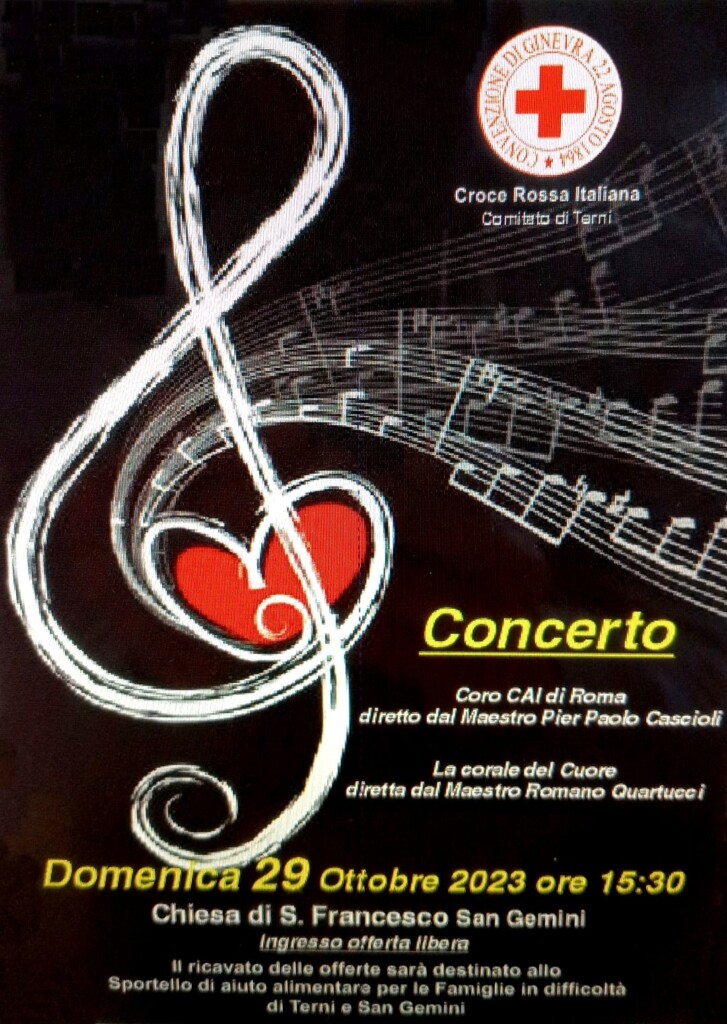 Il Coro del Cai di Roma, diretto dal Maestro Pier Paolo Cascioli e la Corale del Cuore, diretta dal Maestro Romano Quartucci, si incontrano per dar luogo ad una iniziativa di beneficenza organizzata in collaborazione con la Croce Rossa Italiana, Comitato di Terni.