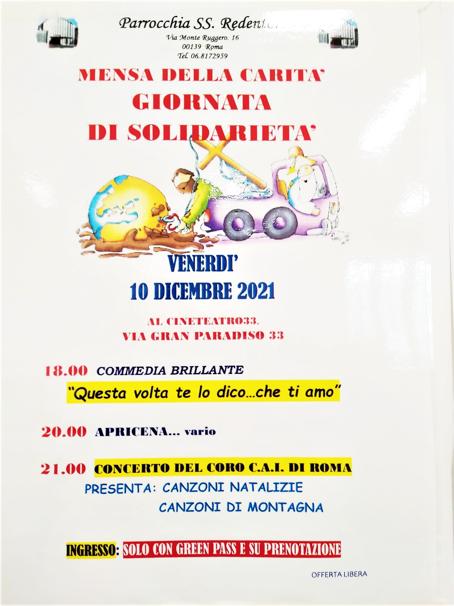 Il Coro del CAI di Roma partecipa alla Giornata della solidarietà con un concerto di beneficenza, Venerdì 10 Dicembre alle 21.00 presso la Chiesa del SS Redentore a Val Melaina, nel cuore del quartiere Monte Sacro.