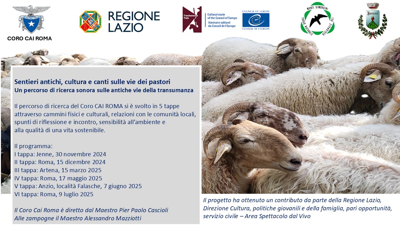 Il progetto “Sentieri antichi, cultura e canti sulle vie dei pastori”, per il quale il Coro ha ottenuto un contributo dalla Regione Lazio, ha avuto come tema un percorso di ricerca sonora sulle antiche vie della transumanza, rete di relazioni storico-culturali, socioeconomiche e artistiche della nostra Italia del centro sud: un patrimonio ricco e vario, da rendere fruibile anche alle giovani generazioni, con attenzione rinnovata agli ambienti naturali, al paesaggio abitato e alle culture tradizionali. Il percorso si è svolto attraverso cammini fisici e culturali, relazioni con le comunità locali, spunti di riflessione e incontro, sensibilità all’ambiente e alla qualità di una vita sostenibile, in un viaggio con interazioni a tutto campo con il pubblico, anche giovanile.